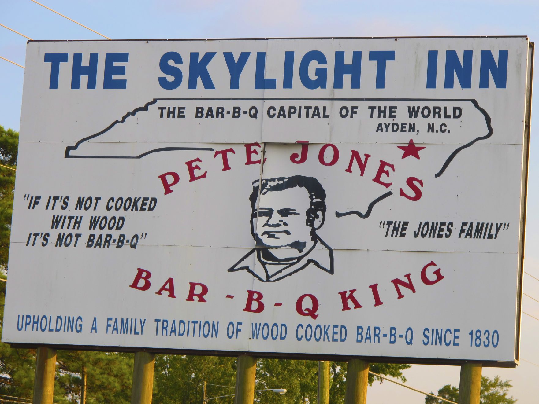 So Here’s the deal on the fare at the Skylight: It’s Carolina all the way: Whole hog, cleaver chopped meat on a sandwich or in a small paper boat, coleslaw and corn bread (from a recipe that dates back to 1830) and that’s pretty much it. And that’s pretty much the way it has been from the time Walter B. “Pete” Jones opened in 1947.