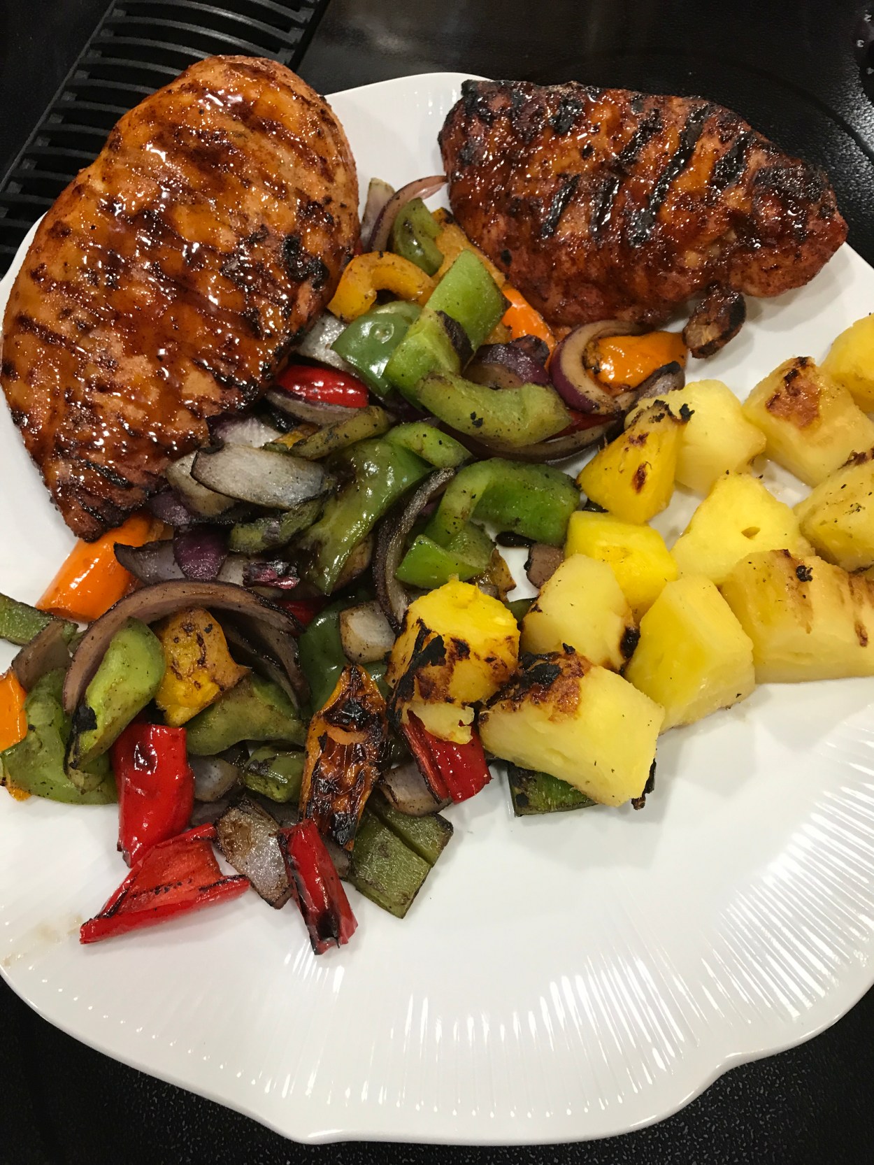 So, it’s been pouring rain in South Téjas for the past couple of days, mitigating against low and slow. Time to do some grillin’: We put our “Uncle Tiny Legs Chicken Spike” on a couple of boneless, skinless breasts overnight, brushed with a little teriyaki about half way through. Grilled onions and peppers, and just for grins – in the luau mode – some grilled pineapple with a just a pinch of our “Seis Pistolas Table Heat”. All is right with the world: