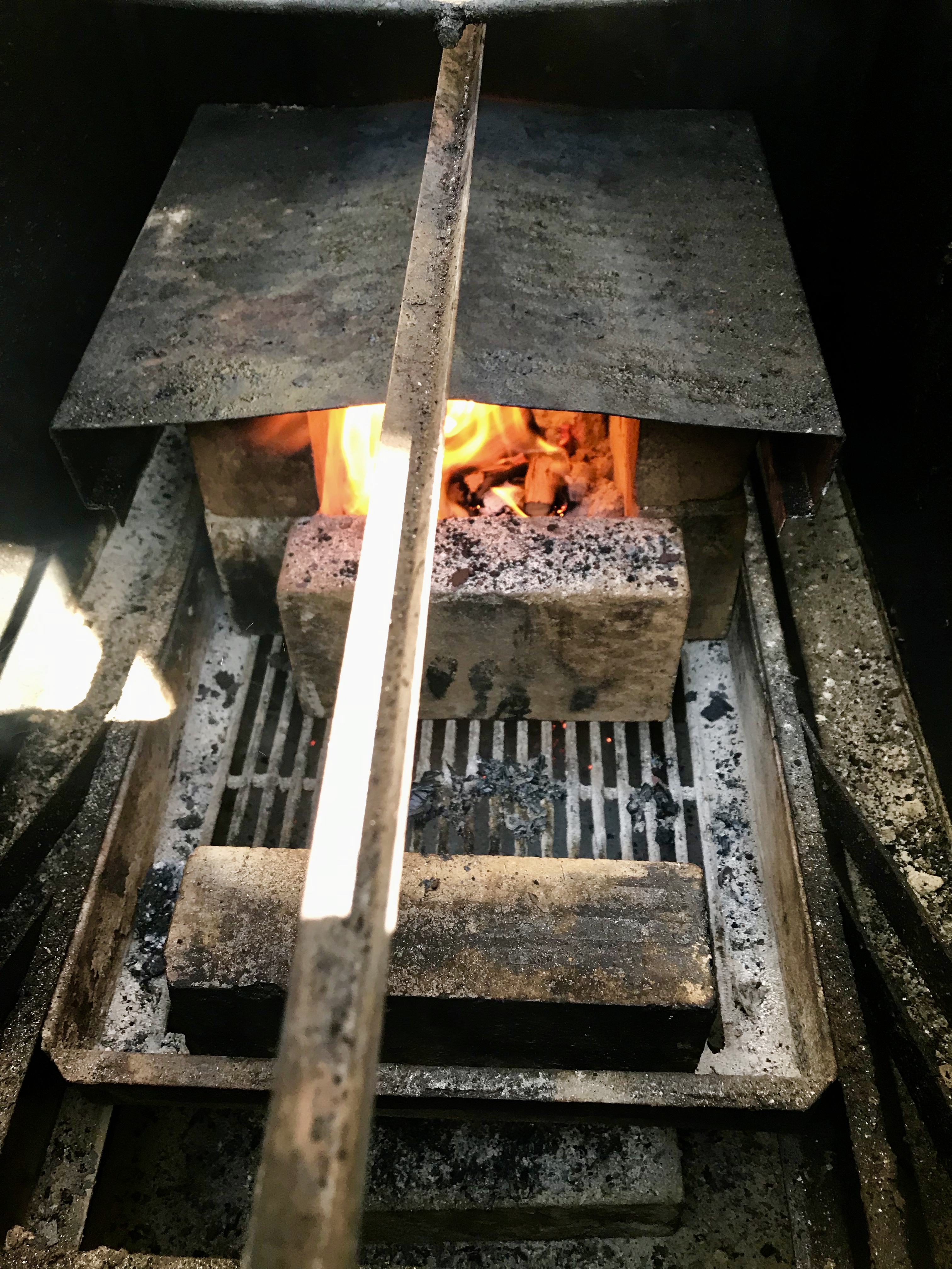 So: First order of business was to develop the “faux offset fire box.” I lowered the ash catcher to the bottom of the unit, then put two vertical firebricks in so the charcoal tray could rest on it. Then I dropped the charcoal tray down and stacked more fire brick to make the offset firebox. Using the heat shield that comes with the unit for the top of the “faux fire box” completed the set up.