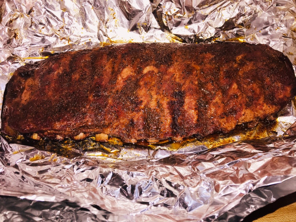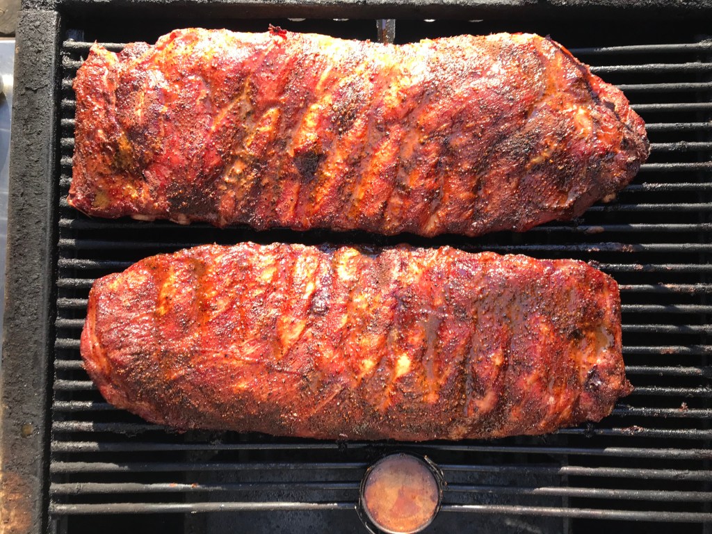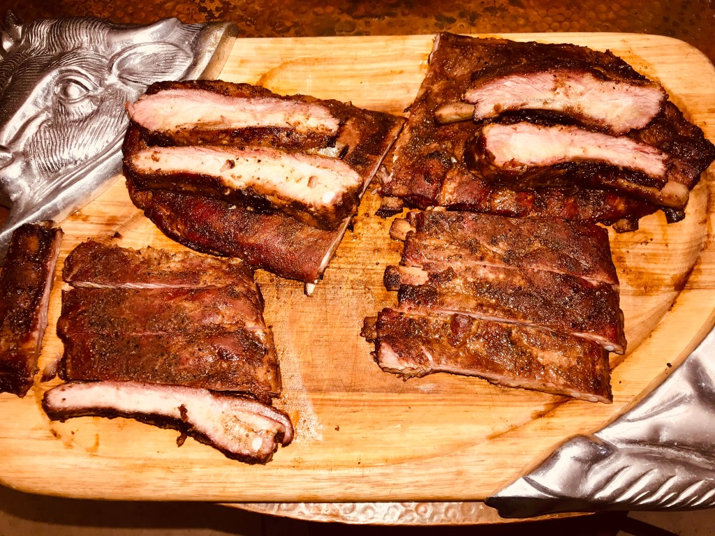 SO NOW COMES THE COOK! To complicate and/or make it all the more interesting, I decided to do a very subtle taste test. One rack – the smaller of the two pictured – is Compart Duroc; and the other Berkshire. What I want to get a handle on here is the relative value of Compart Duroc (retails in San Antonio for about $14/pound. That was $44 for ONE RACK! IF I’m doing this again, I’m ordering direct, online), to Berkshire fromWiatrek’s Meat Market at about $10 for a rack. Still pricey, but hey…it’s R&D and that makes it okay!